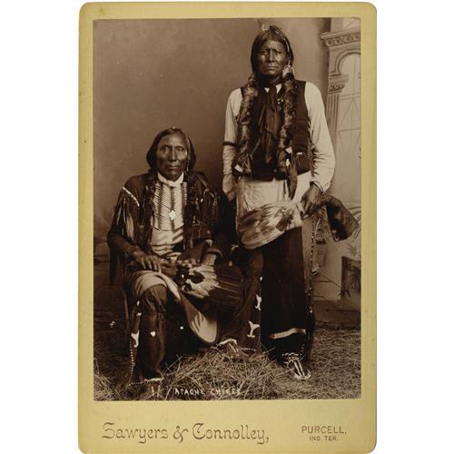 <B>Cabinet Card - Studio portrait of two Kiowa-Apache Chiefs, Da-va-ko and Dor-con-each-la</B></I><BR>Circa 1889 - 1891<BR>Length 6 1/2 in. Width 4 1/4 in.<BR><BR>The seated man is wearing a traditional Southern Plains hide shirt and a bone hairpipe breastplate. Both men have their hair braids wrapped with otter fur and each holds an eagle feather fan.<BR>Photograph by William Lenny between 1889 and 1891. Working out of Purcell, Indian Territory, William Lenny traveled to Anadarko to record life on the Kiowa-Comanche Reservation and the Wichita-Caddo Reservation. He compiled an important record of life on the reservation, taking a number of impressive field photographs and studio portraits. Subjects included Kiowa, Comanche, Kiowa-Apache, Caddo, Wichita, Delaware and Oto Indians. In late 1890, William Sawyers purchased Lenny's interest in their business. John Connolley then worked for the studio in 1891 and 1892. This print was made from Lenny's glass plate negative.<BR>Printed on the front of the card, "Apache Chiefs" and "Sawyers and Connolley, Purcell, Ind. Ter.". The reverse side is blank. Excellent condition and tone.<BR><BR>Reference<BR>Miller, David and Hays, Joe, <I>In Citizen's Garb: The Lenny and Sawyers Images of Native Americans on the Southern Plains 1889 - 1891.</B></I> Museum of the Great Plains, Lawton, Oklahoma, 2005.<BR><BR>