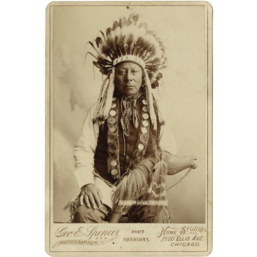 <B>Cabinet Card - Studio Portrait of Chief Last Horse holding a Horse Effigy Stick</B></I><BR>Circa 1893<BR>Length 6 1/2 in. Width 4 1/4 in.<BR><BR>He is wearing an eagle feather bonnet and an otter fur necklace decorated with trade mirrors. He is holding a wood horse effigy stick. Although quite rare, horse sticks have been noted from a number of northern Plains tribes. These dramatic objects were made to honor and commemorate a favorite steed. They were proudly carried at dances during the early reservation years and used for the recounting of war exploits. (For a discussion of horse effigy sticks and a similar photograph of Last Horse, posed standing, in the same studio setting, see: West, Ian "Plains Indian Horse Sticks" in <I>American Indian Art Magazine,</B></I> Volume 3, Number 2, Spring, 1978, pp. 58-67).<BR>Photograph by George E. Spencer, Fort Sheridan (Illinois) bearing his studio imprint on the front of the card. The reverse side is blank. Very good condition, minor abrasion, great tone, tack hole at top.<BR><BR>