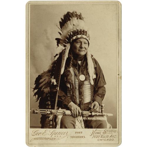 <B>Cabinet Card - Studio portrait of Chief No Neck holding an effigy pipe</B></I><BR>Circa 1893<BR>Length 6 1/2 in. Width 4 1/4 in.<BR><BR>He is seated, wearing an eagle feather bonnet with trailer, a bone hairpipe breastplate, a U.S. Grant peace medal and holding a pipe and stem. The pipe stem is finely carved with the heads of a big horn ram, an elk, a buffalo, and a turtle. The pictured stem is nearly identical to an example offered in this sale (Lot 48089). Photograph by George E. Spencer bearing his studio imprint on the front of the card. Reverse side is blank. Very good condition and tone. Note tack hole on right side.<BR><BR>