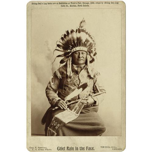 <B>Cabinet Card - A studio portrait of the Hunkpapa Sioux Chief Rain In the Face</B></I><BR>Circa 1893<BR>Length 6 1/2 in. Width 4 1/4 in.<BR><BR>He is posed seated wearing an eagle feather bonnet, a hide coat with porcupine quill decoration, and a wool blanket wrapped around his waist. He is holding a single eagle feather, a pipe and stem and a tobacco bag. Photograph by George E. Spencer and bearing his studio imprint on the front of the card. The reverse side is blank. Very good condition.<BR><BR>