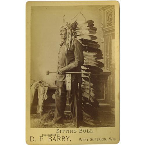 <B>Cabinet Card - Studio portrait of the famous Hunkpapa Sioux Chief Sitting Bull</B></I><BR>Circa 1885<BR>Length 6 1/2 in. Width 4 1/4 in.<BR><BR>In this well known pose, Sitting Bull is wearing a split horn bonnet decorated with ermine skins and having an eagle feather trailer. A beaded knife case is tied to his waist and he is holding a stone head war club. This photo was taken nine years after his stunning victory over Custer's 7th Cavalry on the Little Bighorn, June 25, 1876. Pursued by the United States military, Sitting Bull led his followers into exile in Canada in 1877. He returned to the United States in 1881 with the promise that he could join his people at Standing Rock. However, he was held as a military prisoner for two years at Fort Randall. Released in May, 1883, Sitting Bull continued the struggle to protect his people, their land, and way of life. Photograph by D. F. Barry with his studio imprint on the front of the card. The reverse side is blank. Excellent tone and condition.<BR><BR>