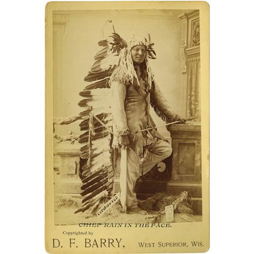 <B>Cabinet Card - Studio portrait of the Hunkpapa Chief Rain In the Face</B></I><BR>Circa 1885<BR>Length 6 1/2 in. Width 4 1/4 in.<BR><BR>Rain In the Face is wearing a split horn bonnet decorated with ermine skin and having an eagle feather trailer. He has a fringed hide jacket and is holding a stone head war club. The headdress and club were studio props. Barry posed Sitting Bull wearing these same objects (Lot 48202). It was alleged that Rain In the Face killed Thomas Custer during the Battle of the Little Bighorn and mutilated his body. This myth was then popularized by the poet Henry Wadsworth Longfellow in "The Revenge of Rain In the Face". However, in an interview with the noted Santee Sioux physician and writer, Dr. Charles Eastman, Rain In the Face stated: "Many lies have been told of me. Some say that I killed the Chief (George Armstrong Custer), and others that I cut out the heart of his brother (Tom Custer) because he had caused me to be imprisoned. Why, in that fight the excitement was so great that we scarcely recognized our nearest friends! Everything was done like lightning. After the battle we young men were chasing horses all over the prairie, while the old men and women plundered the bodies." Photograph by D. F. Barry with his studio imprint on the front of the card. Reverse side is blank. Excellent condition and tone.<BR><BR>Reference<BR>Eastman, Charles A., <I>Indian Heroes and Great Chieftains.</B></I> Lincoln: University of Nebraska Press, 1991, p. 150.<BR><BR>