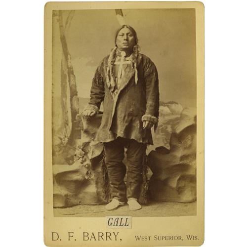 <B>Cabinet Card - Studio Portrait of the Hunkpapa Sioux Chief Gall</B></I><BR>Circa 1885<BR>Length 6 1/2 in. Width 4 1/4 in.<BR><BR>Gall is wearing a large German silver cross and is dressed in a hide jacket, leggings, moccasins, and otter fur braid wraps.<BR>Gall was an esteemed warrior and a fierce opponent of white aggressors prior to his settlement on the Standing Rock Reservation. A large part of his fame centers around his heroics at the Battle of the Little Bighorn on June 25, 1876. Gall admirably led and rallied his fellow warriors throughout the battle, first repulsing Reno's column and then attacking and annihilating Custer and his troops.<BR>D.F. Barry took a number of well known portriats of Gall. In later years, Elizabeth Custer would write the photographer, "Mr. Barry, Painful as it is for me to look upon a pictured face of an Indian, I never dreamed in all my life, there could be so fine a specimen of a warrior, in all the tribes as Chief Gall. - Mrs. Elizabeth B. Custer".<BR>Photograph by D.F. Barry with his studio imprint on the front. The reverse side is blank.<BR><BR>Reference<BR>Heski, Thomas. <I>The Little Shadow Catcher.</B></I> Seattle: Superior Publishing Co., 1978, p.111.<BR><BR>