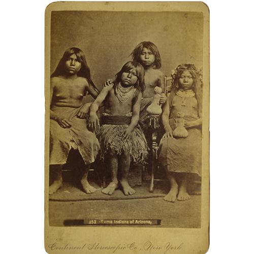 <B>Cabinet Card - Studio portrait of four Yuma girls</B></I><BR>Circa 1870<BR>Length 6 1/2 in. Width 4 1/4 in.<BR><BR>The two girls on the right are holding pottery effigy vessels. These ceramics were likely made for sale to traders and tourists. Stamped in ink on the reverse "From Gold's Free Museum. Dealer in Indian & Mexican Potteries, Curiosities, & C., J. Gold, Manager, Santa Fe, N.M." Printed on the front "152. Yuma Indians of Arizona. Continent Stereoscopic Co., New York."<BR>Very good condition and tone.<BR><BR>
