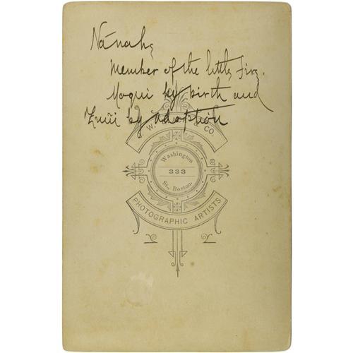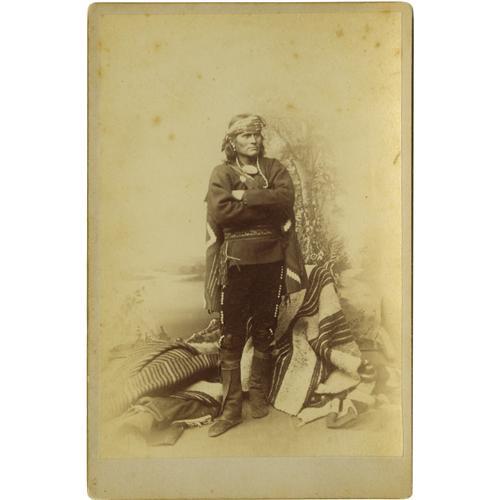 <B>Cabinet Card - Studio portrait of Nanake wearing a classic Navajo Serape</B></I><BR>Circa 1885<BR>Length 6 1/2 in. Width 4 1/4 in.<BR><BR>He is posed with a Navajo blanket draped over his shoulder. The reverse reads "Nanake, Member of the little fire. Moqui by birth and Zuni by adoption" in period script. The reverse also bears the studio imprint of J. W. Block & Co., Photographic Artists, 333 Washington St., Boston. Very good condition, light foxing.<BR><BR>