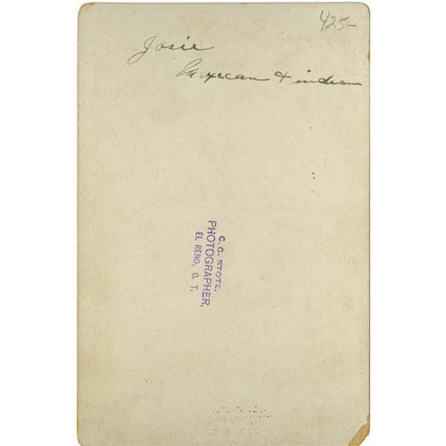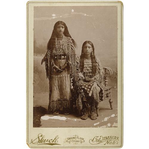 <B>Cabinet Card - A studio portrait of two Kiowa girls</B></I><BR>Circa: 1890<BR>Length 6 1/2 in. Width 4 1/4 in.<BR><BR>Both girls are wearing hide dresses decorated with cowrie shells and traditional boot moccasins. Written on the reverse, "Josie, Mexican & Indian". The reverse also bears the ink stamp "C. C. Stotz, Photographer, El Reno, O.T.". The front bears the imprint of "Shuck, Ground Floor Studio, Columbus, Neb.".<BR><BR>