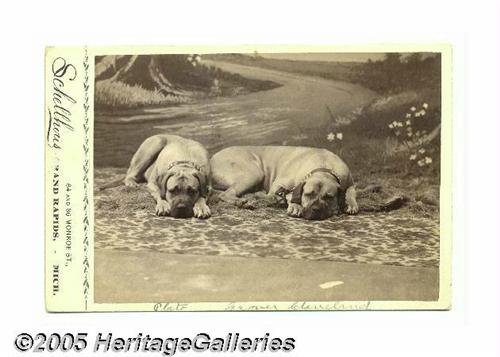 <B>Cabinet Card of Two Dogs, "Plato" and "Grover Cleveland"</B></I> An excellent posed, studio photograph of two very bored-looking dogs, laying on a rug and looking sleepily at the camera. The handwritten caption in the lower border apparently gives their names as "Plato" and "Grover Cleveland." Actually, you can <I>almost</B></I> see the resemblance to our beloved 22nd (and 24th) president! Photo studio is Schellhous in Grand Rapids, Michigan. Excellent, almost humorous, image in excellent condition save for a slight rub in the photographer's address area. Lot:251
