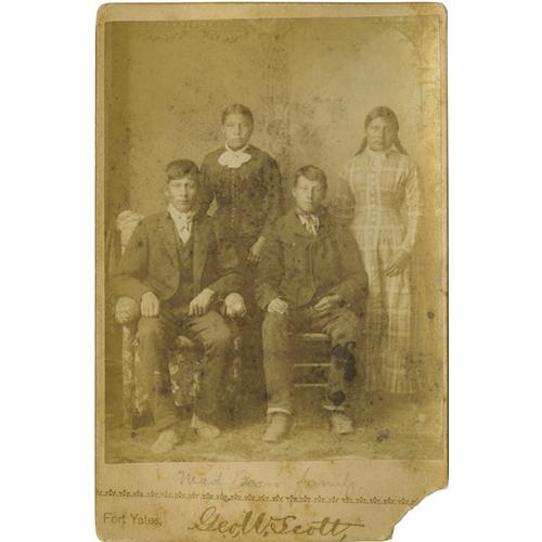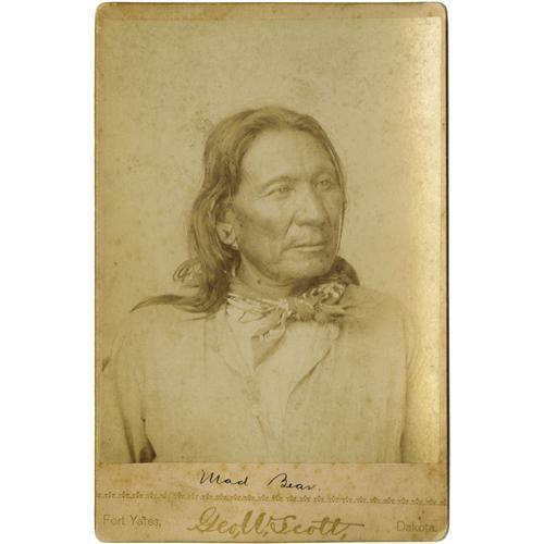 <B>Cabinet Cards (2) - Studio portraits of Mad Bear (Sioux) and Mad Bear's family</B></I><BR>Circa 1885<BR>Length 6 1/2 in. Width 4 1/4 in. each<BR><BR>Both photographs taken by George W. Scott at Fort Yates and bearing his imprint on the front of the cards. Fair condition with fading, light foxing, one tear.<BR><BR>Provenance<BR>Skinners Auctioneers, Sale 2265, Lot 444, January 29, 2005.<BR><BR>