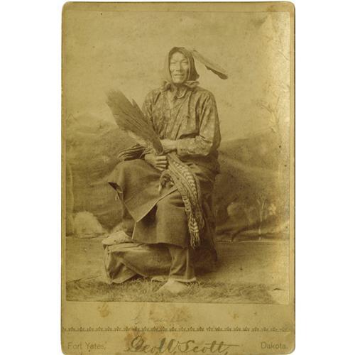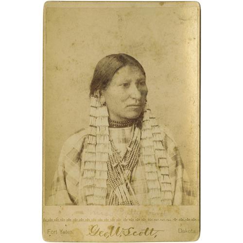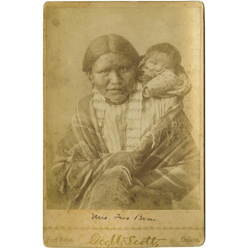 <B>Cabinet Cards (3) - A group of three studio portraits of Sioux Indians</B></I><BR>Circa 1885<BR>Length 6 1/2 in. Width 4 1/4 in. each<BR><BR>The set includes Mrs.Two Bear posed with her child and wearing dentalium shell earrings; Pretty Bird wearing a choker necklace, a necklace made of multiple loops of brass beads and bone hairpipes, and two elaborate pair of dentalium shell earrings; and Crawler posed seated holding an eagle wing fan. Photographs taken by George W. Scott at Fort Yates and bearing his imprint on the front of the cards. The reverse sides are blank. Fair condition with fading and foxing.<BR><BR>Provenance<BR>Skinners Auctioneers, Sale 2265, Lot 447, January 29, 2005.<BR><BR>