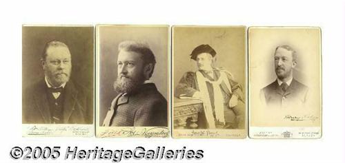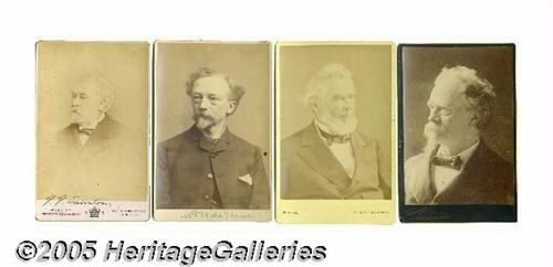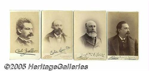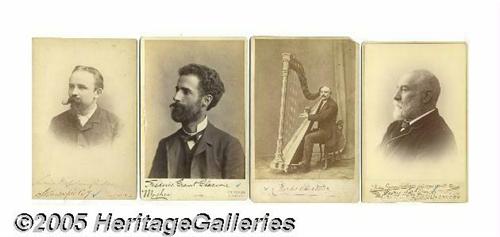 <B>Cabinet Cards of 19th Century Composers, Including Calixa Lavallee, Author of the Canadian National Anthem</B></I> A wonderful group of nineteen (19) cabinet card photographs of nineteenth century composers, some signed, including a fine bust portrait of Calixa Lavallee (1842-1933) bearing his signature. Lavallee, a Quebec born composer, pianist, organist and teacher was commissioned by the provincial authorities to write music to go with a poem by Adolphe-Basile Routheir entitled <I>O Canada,</B></I> which was first performed in 1880. The group also includes sixteen other signed cabinet card photos, including Joseph Parry (1841-1903), Adolph Neuendorff (1843-1897), William Joseph Westbrook (born 1831), Henry Lahee (1826-1912), Charles Obertheir, Frederic Grant Gleason (1848-1903), Louis Napoleon Parker (1852-1944), Thomas Anderton (1836-1903), John Barnett (1802-1890), dated in his hand "Sper. 9 1887," Henry Parker, B. J. Lang, Frederick Brandeis, Carilli Zoeller (1840-1889), and Jules Parks. Also included is a nice cabinet card of Anton Bruckner together with five other unidentified portraits (three of which are signed) certainly worthy of further research. Overall the cards bear the occasional dent to margins and very light soiling, but are in otherwise fine condition, most very crisp and clear. A rare assemblage that would prove difficult to duplicate. Lot:251