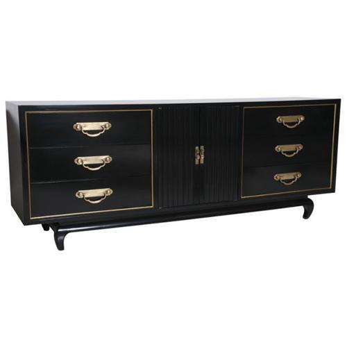 Description: Cabinet / Console / Dresser by American of Martinsville, stamped. 6 drawers and 2 doors reveal 3 drawers. A quality piece with Hollywood Regency stylings.