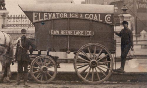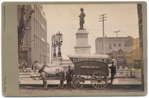 Cabinet card by McKecknie & Oswald, Toledo, Ohio. This is indeed wholely Toledo: the wagon is parked squarely in front of the monument to General James Blair Steedman. But the Baw Beese Lake Ice & Coal Company [identified on the side of the wagon] must have come all the way from Hillsdale County, Michigan! Light brown stain at right. [3-]