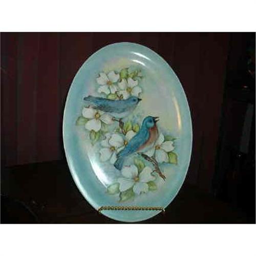 Hand painted with bluebirds. 15.3/4" X 11". Made by Tirschenreuth later Hutschenreuther. Circa 1927. Excellent Condition.