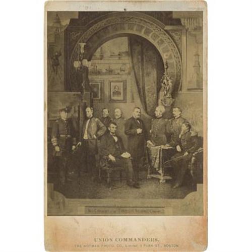 <B>Cabinet Print of Abraham Lincoln and the Union Commanders,</B></I> 4.25" x 6.5", the front marked "The Notman Photo Co. Limited, 8 Park St., Boston.", the verso marked "With Complements of The Travelers Life and Accident Insurance Company of Hartford, Conn.". With ink notations on the back and a thumb tack hole at the top. Some surface wear else very good <BR><BR><b>Shipping:</b> Flat Material, Small (<a target="_blank" href="http://www.heritageauctions.com/common/shipping.php">view shipping information</a>)