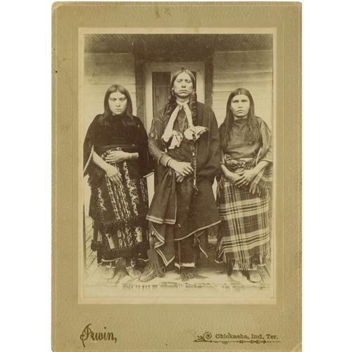 <B>Cabinet Size Photo Mounted on Card Stock - Quanah Parker and Wives</B></I><BR>Circa 1892<BR>Length 7 3/8 in. Width 5 1/4 in.<BR><BR>In this well known image, the famous Comanche Chief Quanah Parker is posed on the front porch of his house with his wives To-pay and Cho-ny. Quanah is wearing hide leggings and moccasins, his hair braids wrapped with otter fur. Photograph by Irwin, Chickasha, Indian Territory with his studio imprint on the front of the card. Reverse side is blank. Very good condition with nice tone.<BR>Working out of Chickasha, Indian Territory, Irwin traveled to Fort Sill and Anadarko to photograph the local Indian people. He compiled a fine body of work, including field photographs and studio portraits. Many of these images were reproduced for sale as cabinet cards. His subjects include Kiowa, Comanche, Wichita, and Caddo Indians. Irwin also photographed Geronimo while he was imprisoned at Fort Sill.<BR><BR>