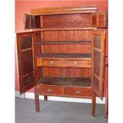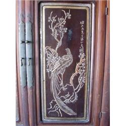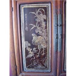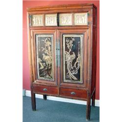 Two-section cabinet, painted softwood, lacquered panels with Mother of Pearl floated in, Buyer must arrange own packing & shipping or pick-up.