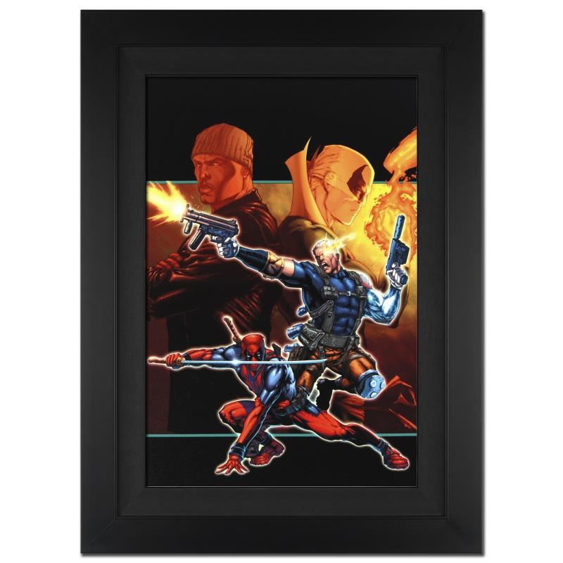A piece of comic book history, this limited edition, from original art by Patrick Zircher, depicts Deadpool, Cable, Iron fist, and Luke Cage. Zircher's early career as an illustrator in the genre began with production of several completed works for Villains and Vigilantes, Champions and other pen and paper role-playing games as well as early stints with independent comic book publishers. Following this, he went on to work largely for Marvel Comics on leading titles like Iron Man, Thunderbolts and New Warriors but also did a considerable amount of work for DC. He is currently exclusive with Marvel Comics. "Cable & Deadpool #21" is an extremely limited edition giclee on canvas by Patrick Zircher presented by Marvel Comics, hand signed by the great Stan Lee and numbered out of only 10! This piece comes custom framed and ready to hang. Includes Certificate of Authenticity! Measure approx. 25" x 34" (with frame), 18" x 27" (image).
