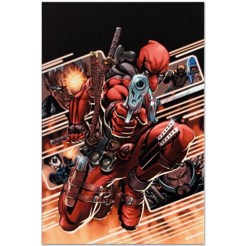 A piece of comic book history, this limited edition, from original art by Patrick Zircher, depicts Deadpool and Cable among other X-Men characters. Zirchers early career as an illustrator in the genre began with production of several completed works for Villains and Vigilantes, Champions and other pen and paper role-playing games as well as early stints with independent comic book publishers. Following this, he went on to work largely for Marvel Comics on leading titles like Iron Man, Thunderbolts and New Warriors, but also did a considerable amount of work for DC. He is currently exclusive with Marvel Comics. Cable & Deadpool #9 is a limited edition giclee on canvas by Patrick Zircher presented by Marvel Comics! This piece comes gallery wrapped. Includes Certificate of Authenticity! Measures approx. 18 x 27 (image). This item requires special handling and may have a longer than usual turnaround.
