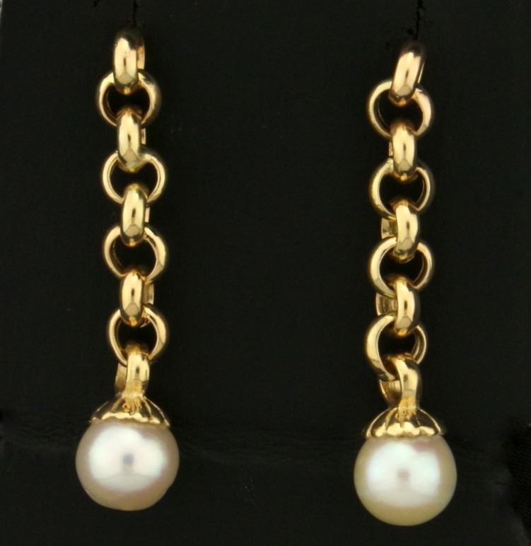 In 14k yellow gold. Each earring contains a 7.5mm pearl with excellent color and luster. 1 1/4" long, with friction backs. 3.7g.