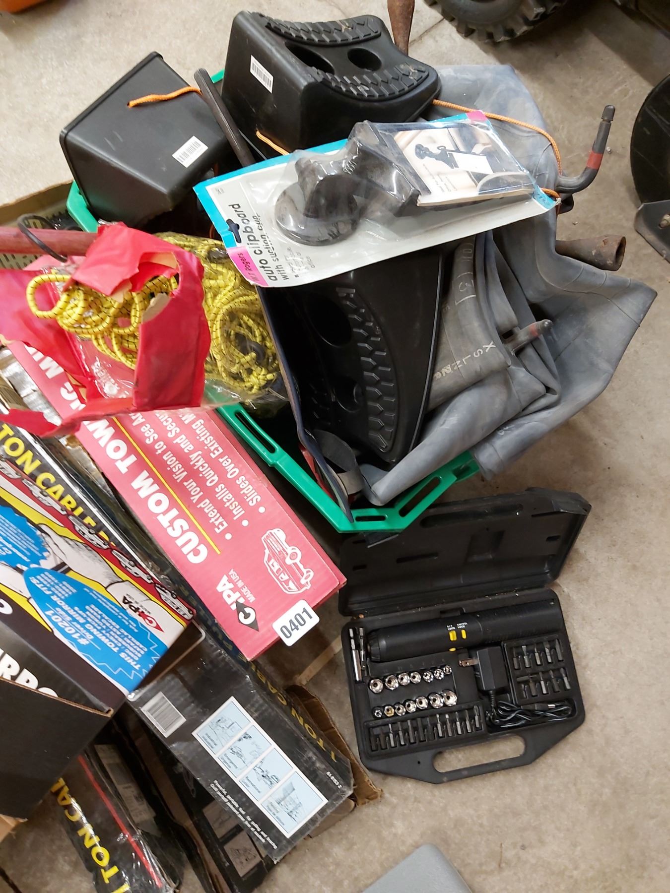 Cable pullers (x2, 1 ton), towing mirror, Power Boost 1200, PetroCan OW30 oil, inner tubes, socket wrench sets (x2)