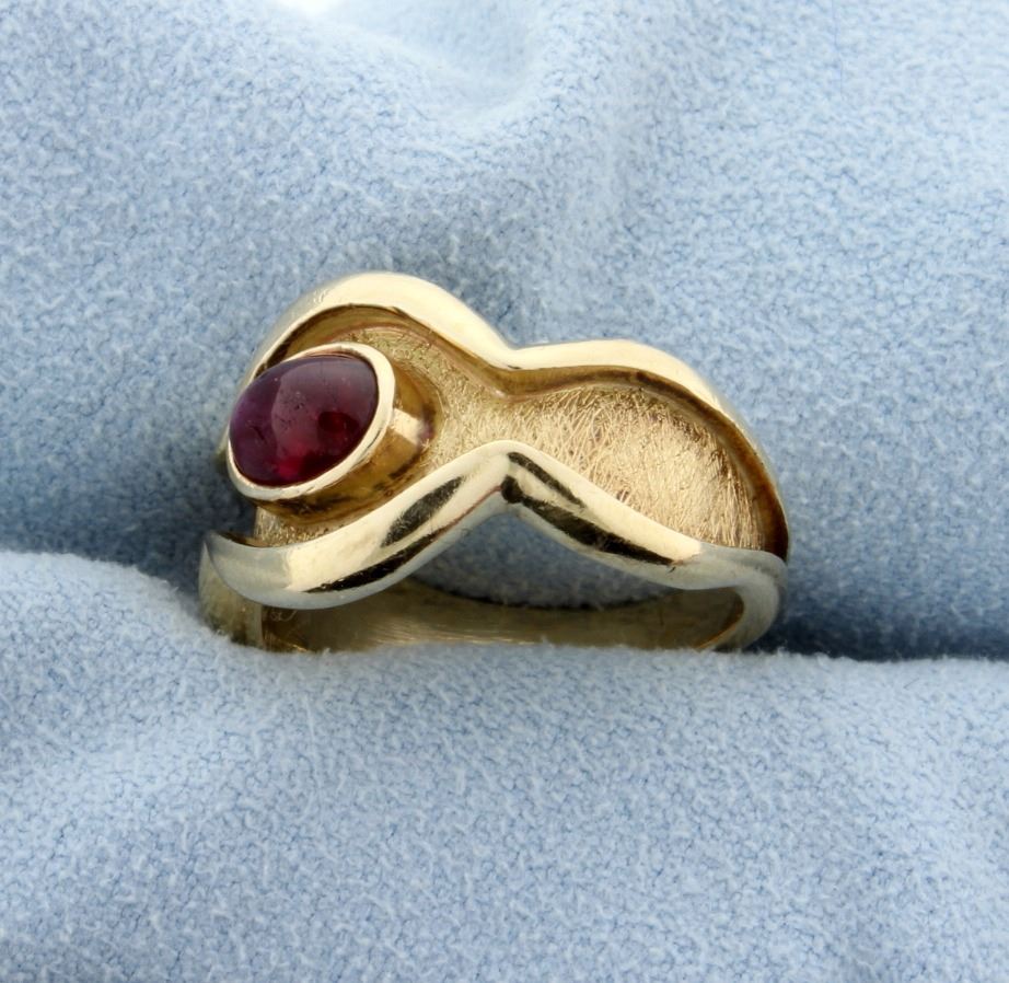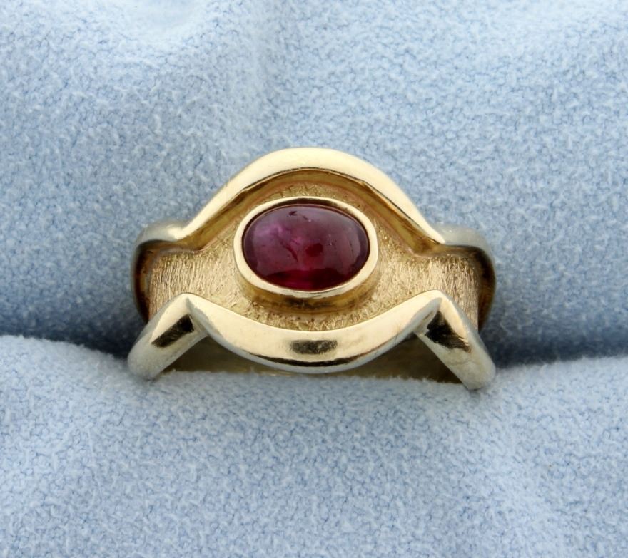 In 14K yellow gold, the ring contains a 7x5mm high quality cabochon ruby, with excellent color and clarity. Size 7 6.7g