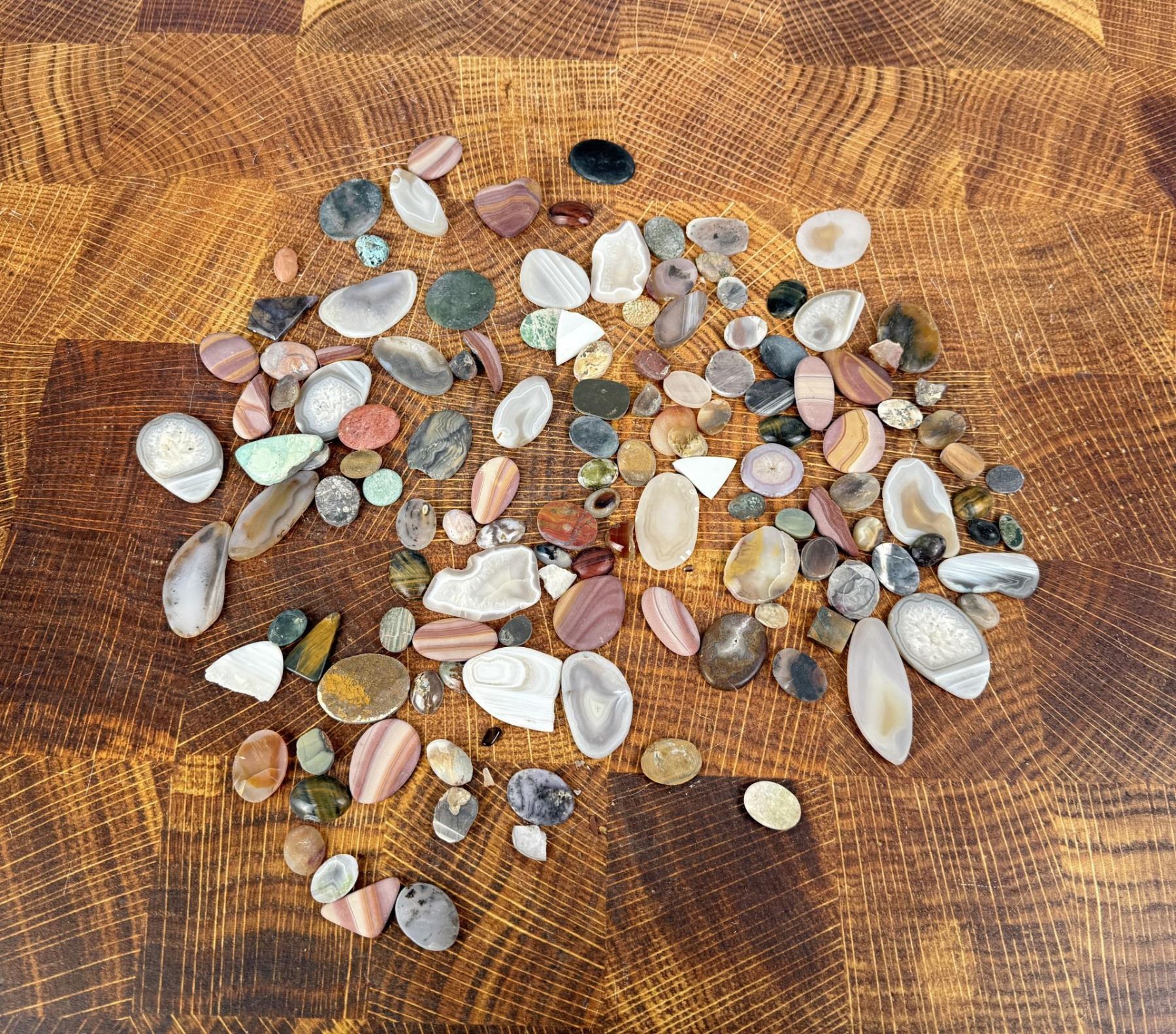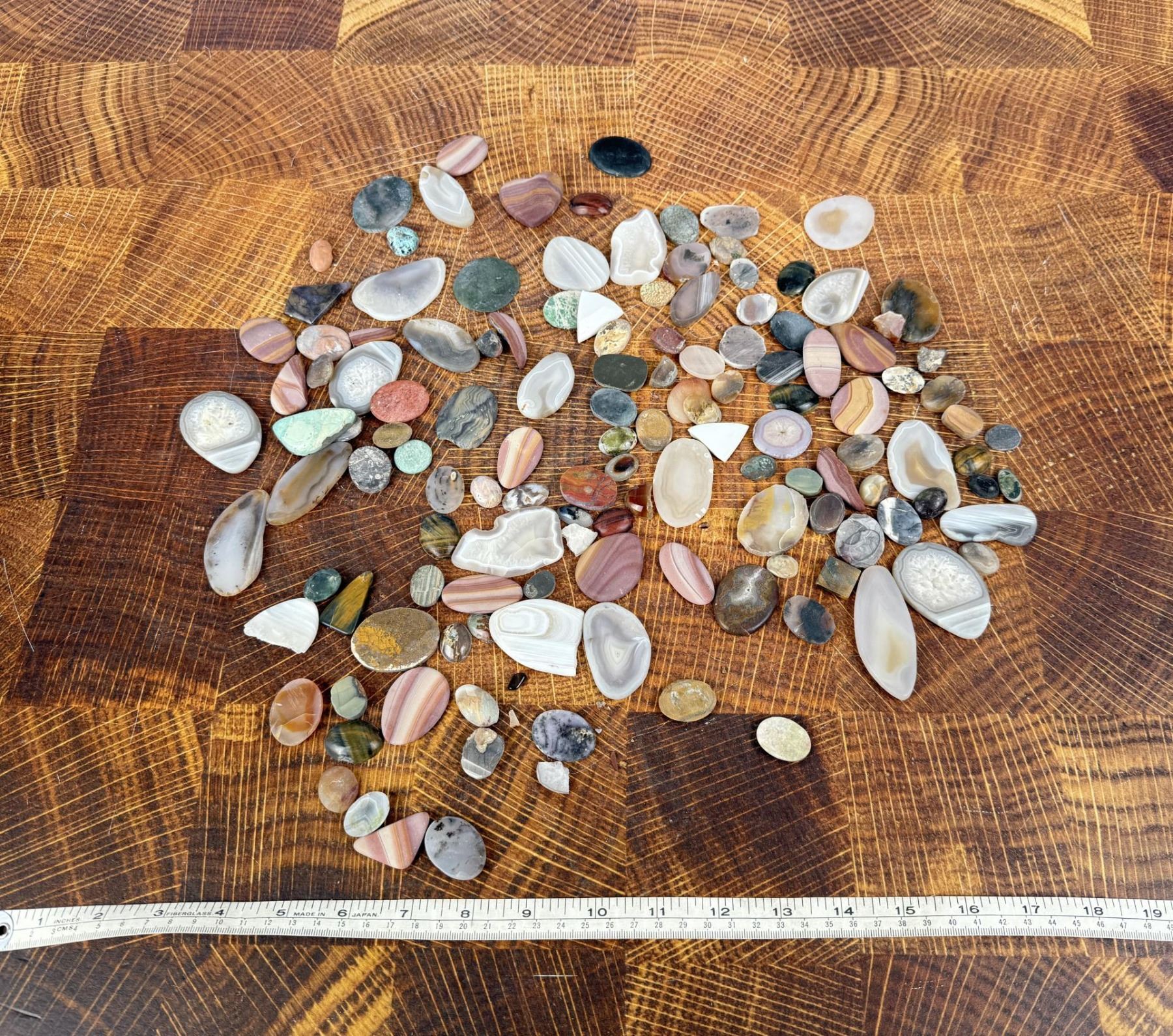 Includes agates, jasper, petrified wood, & more. 1.8 lbs. Provenance: From the estate of Moosehead Gallery rock shop in Hamilton, Montana.