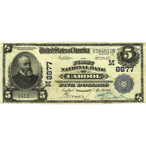 <B>Cabool, MO</B></I> - $5 1902 Plain Back Fr. 605 <B>The First NB</B></I> Ch. # (M)8877<BR>A very scarce one bank community where the sole issuer issued large notes only. Just six notes comprise the entire census, with this piece new to that listing. It is by far the highest grade specimen reported, grading <B>Very Fine-Extremely Fine.</B></I> Look for bidding to reach or exceed...