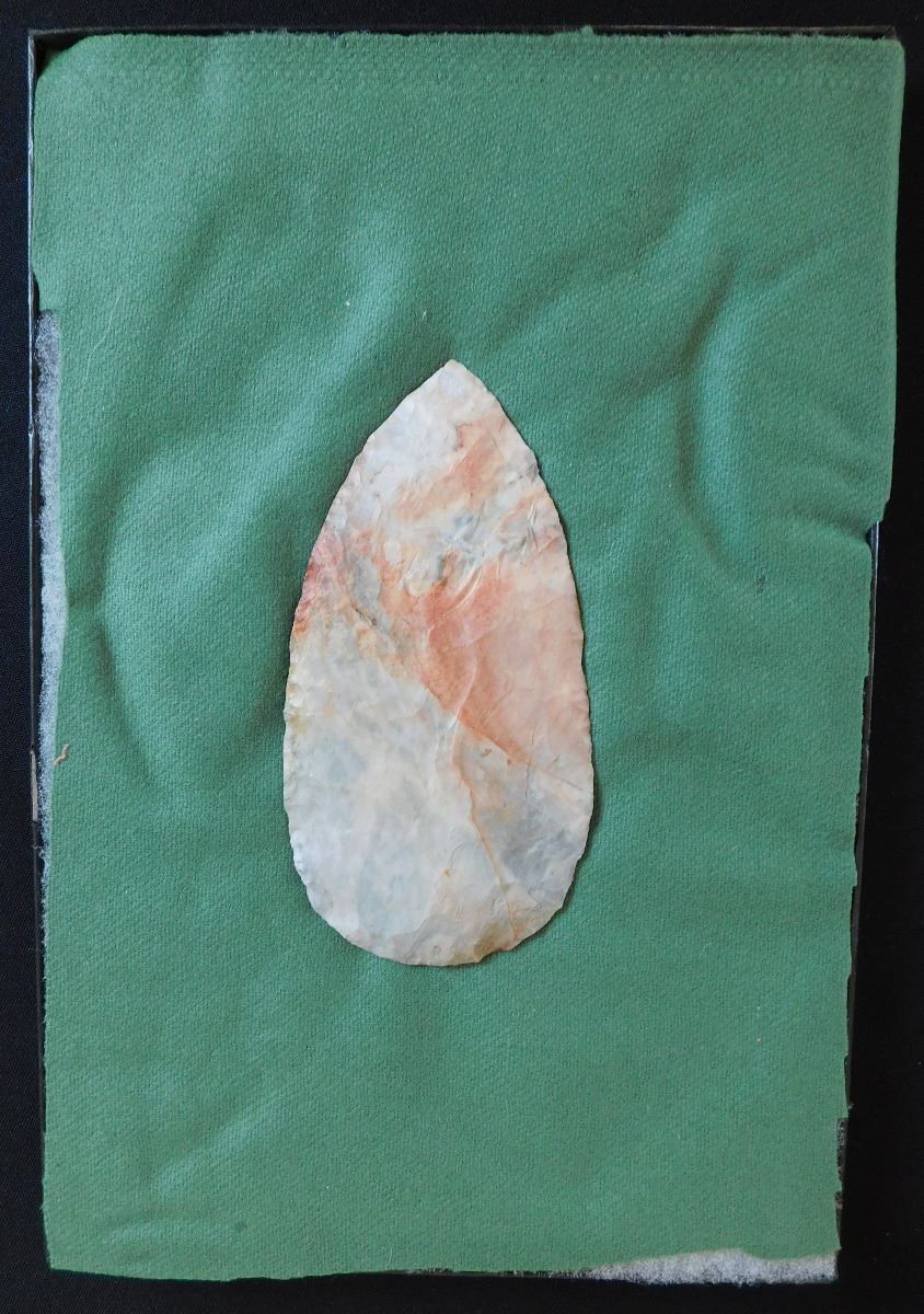 Cache Blade from Flint Ridge, pre-historic item. Made of flint ridge chert, this item measures 5.75" x 3" x 0.5". From Licking County, Ohio. This chert has orange, white and blue grey colors. Condition: Very good, see images. Shipping: $30.00 w/insurance.