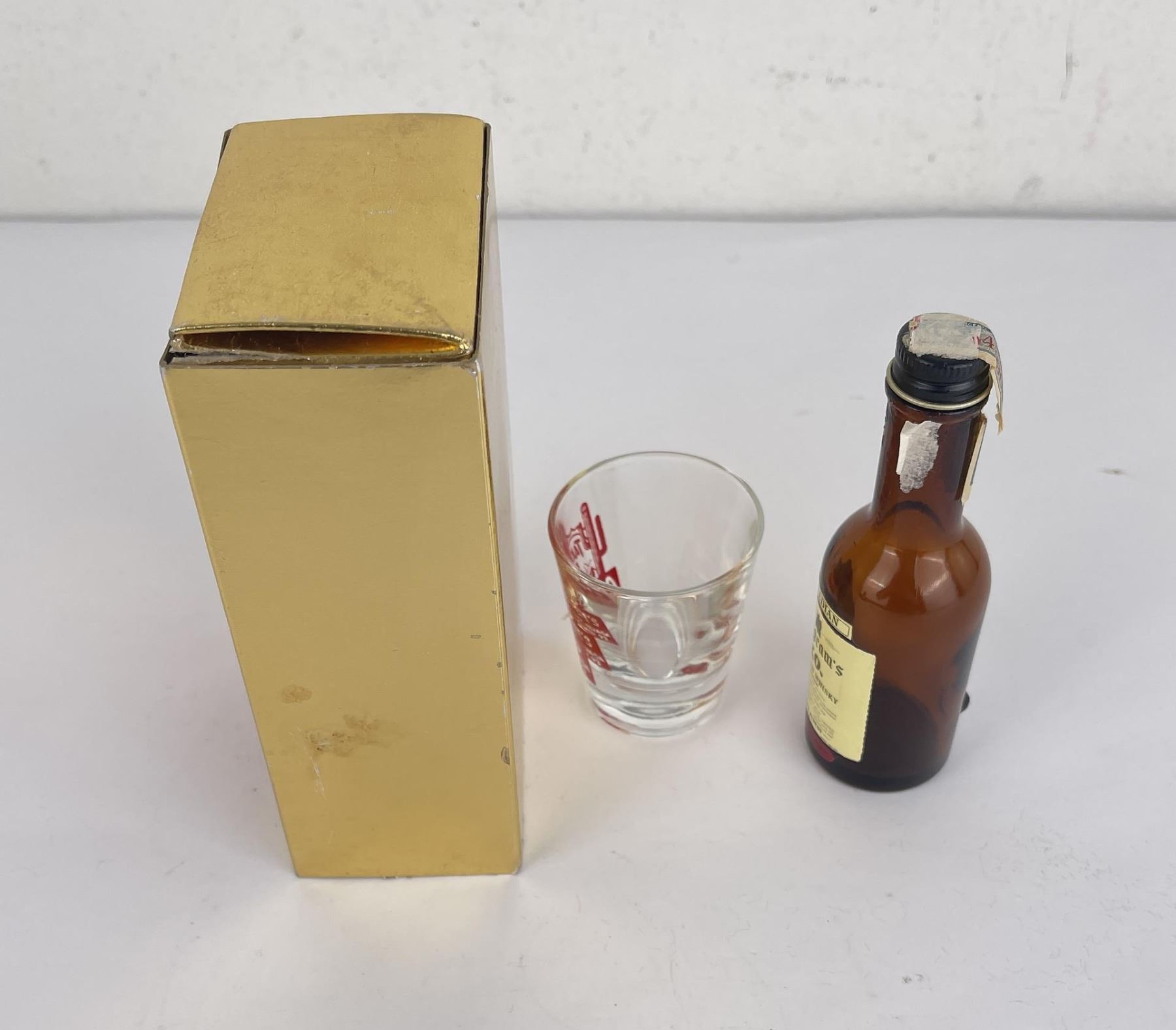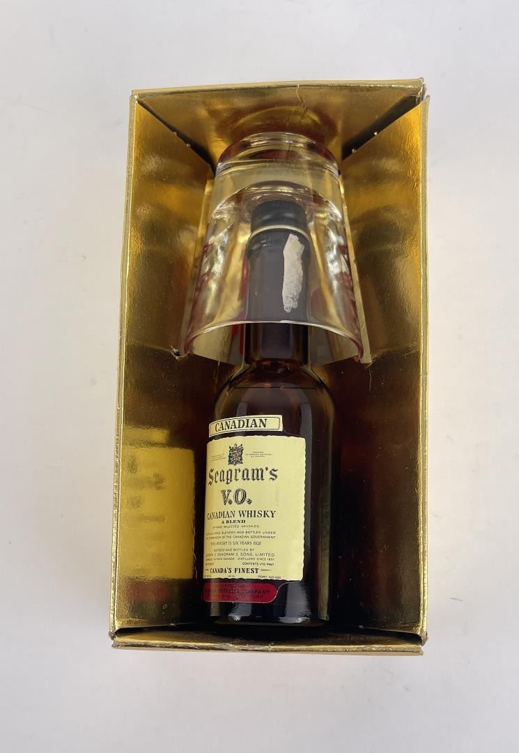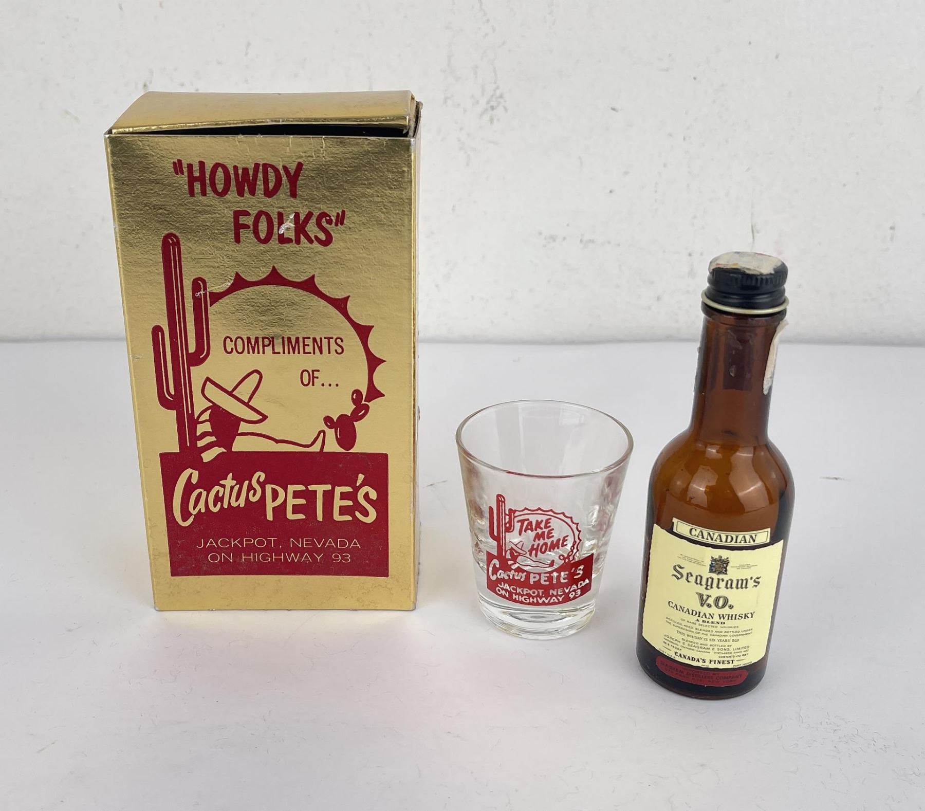 Seagram's Canadian Whisky gift set with shot glass. Gift set from Cactus Pete's Jackpot NV Casino, 1966. Compliments of the house. Bottle has been opened and likely consumed.