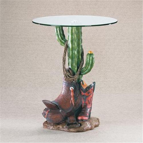Southwest design glass-top table with boot, </P>
