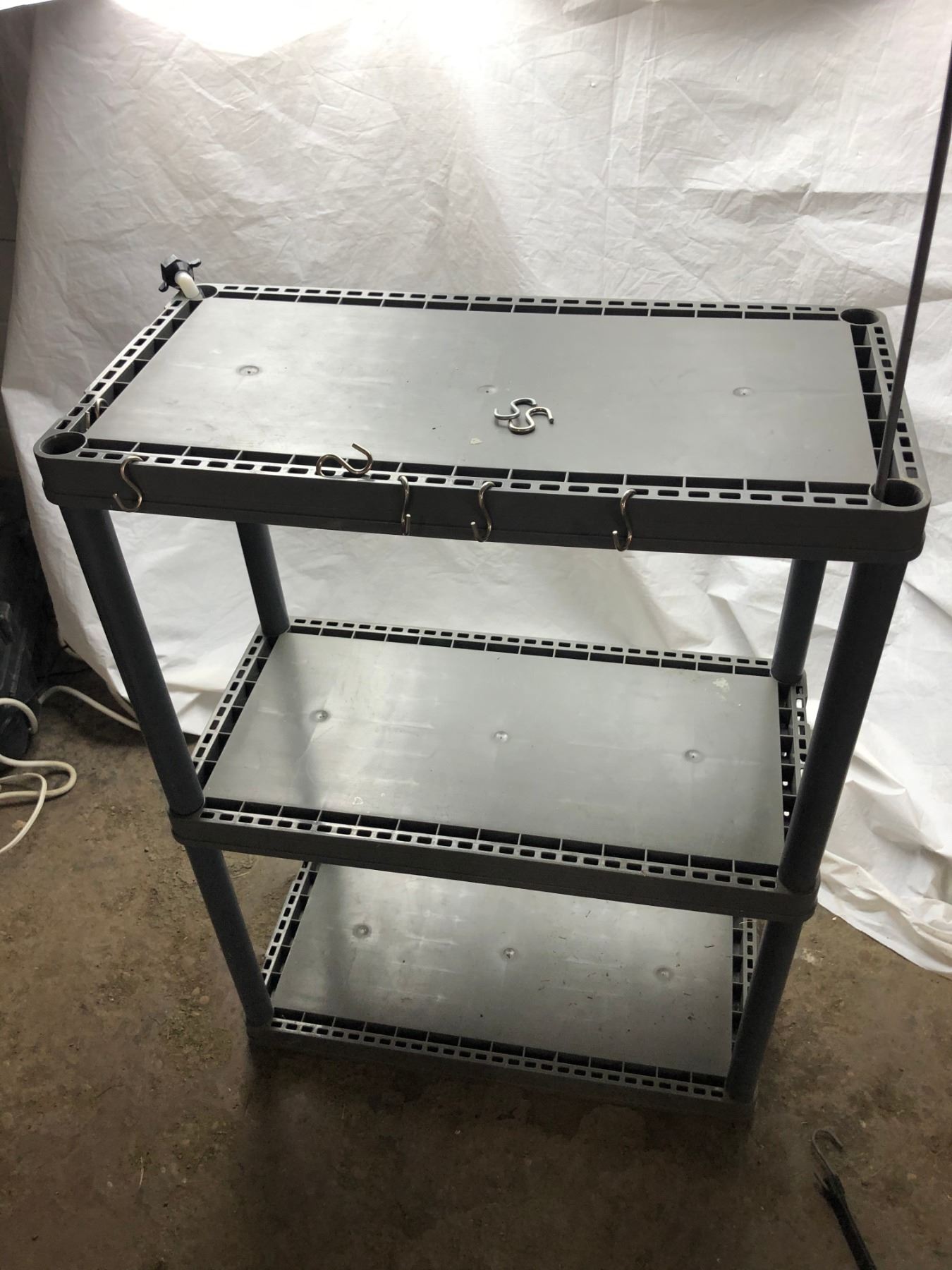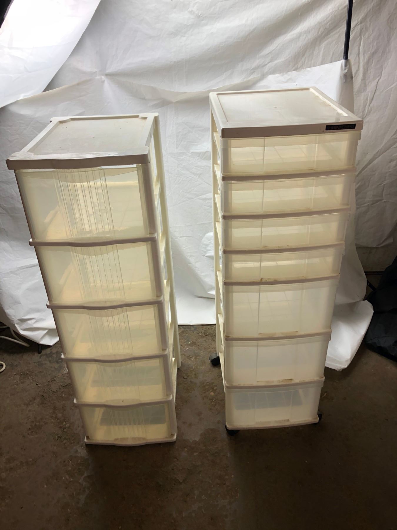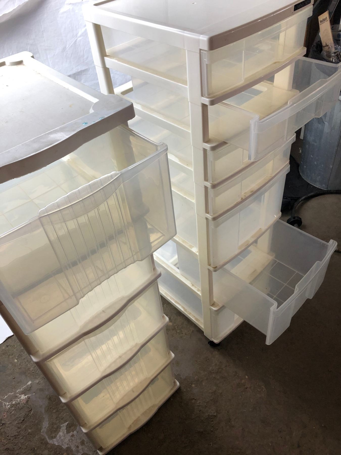 2 clear drawer caddies - 1 with wheels and 1 gray shelving unit