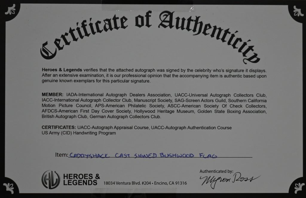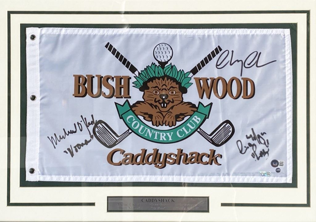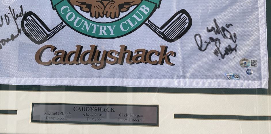 Caddyshack Bushwood Country Club signed flag autographed by Chevy Chase, Cindy Morgan and Michael O'Keefe. Custom matted and framed. 20x28 inches. Beckett authenticated. PAD136