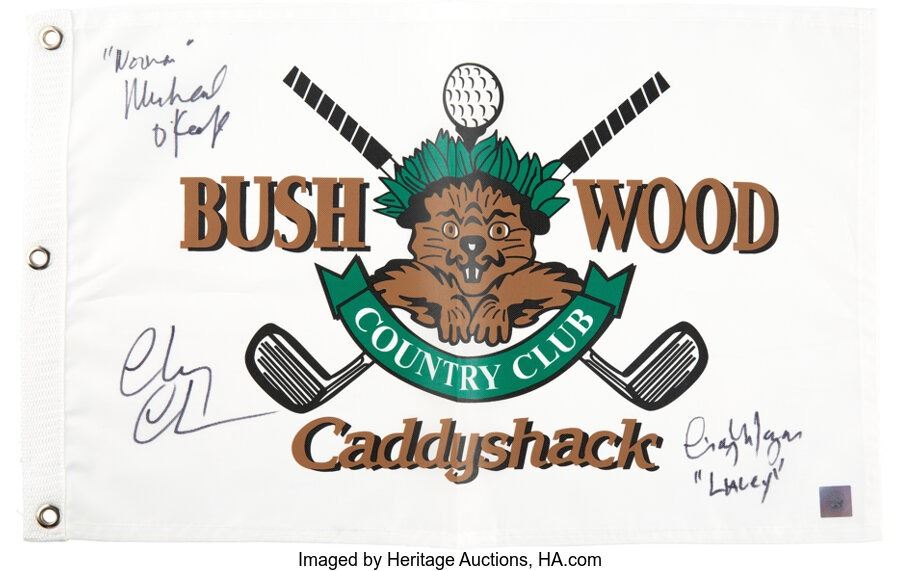 CaddyshackCast Signed Golf Pin Flag. A replication of a pin flag for the Bushwood Country Club, signed by three cast members of the Harold Ramis-directed comedy. Signatures include: Chevy Chase, Cindy Morgan, and Michael O'Keefe. Morgan and O'Keefe's signatures have their character's names under them. Measures 12 ½" x 20 ½". Folded. In Very Good Plus condition with large fold marks through the center. Hologram Sticker from Super Star Greetings. LOA from PSA/DNA. COA from Heritage Auctions.