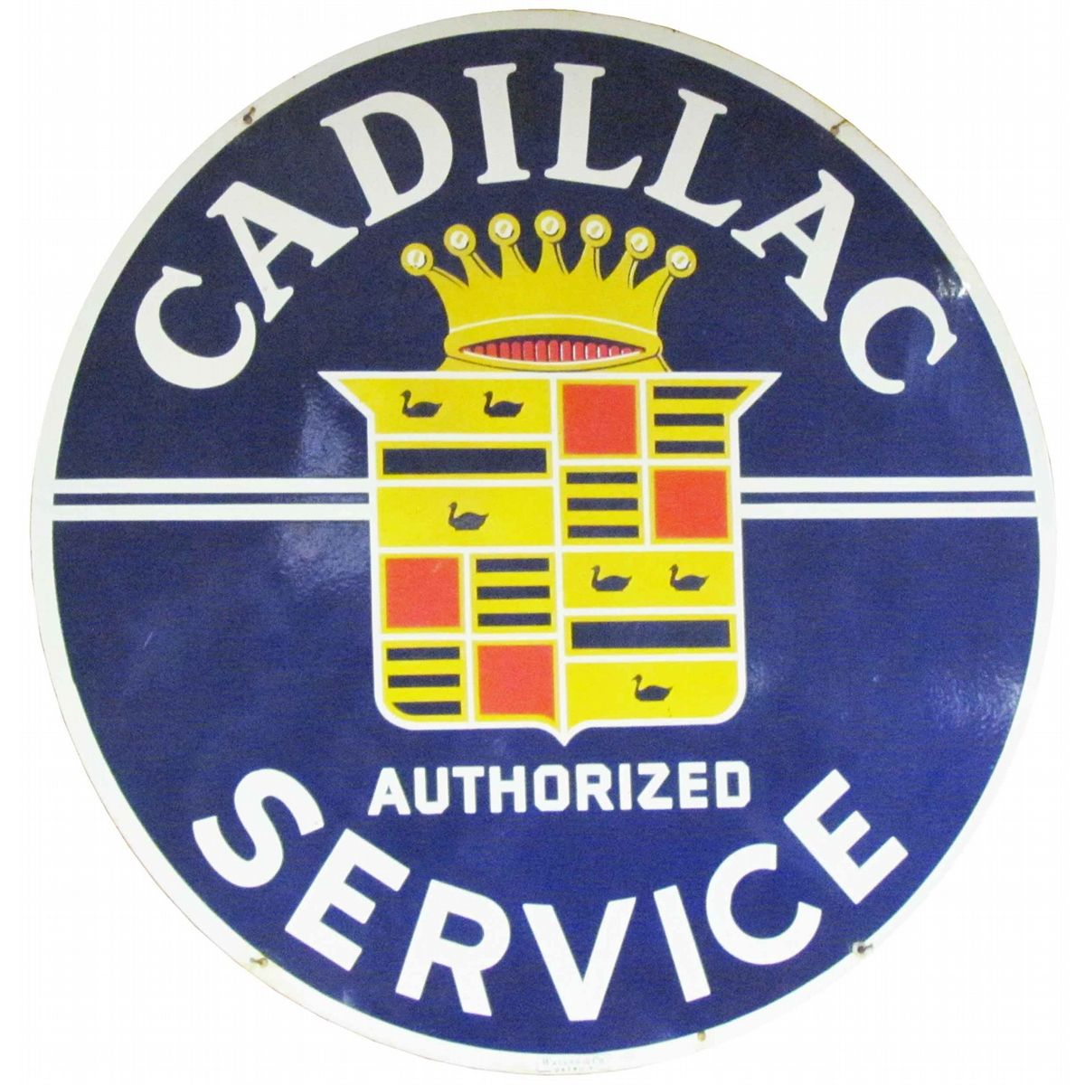 Cadillac Porcelain Service Sign. Made by Walker & Co. Detroit. Edge repairs and repairs at grommets otherwise excellent condition. 42 inch diameter.
