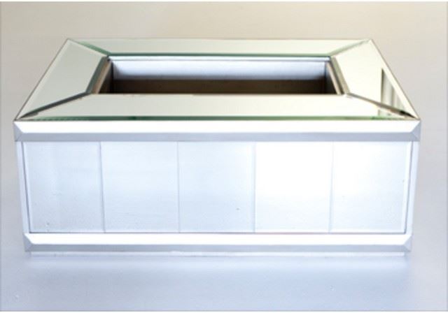 Cadillac Water Coffee Table - The antique silver and mirror Cadillac Collection embodies modern sophistication. Has interior shelving. The finish on these remarkable pieces is like a chameleon skin. Dimensions: 5'2'' W x 3'6'' D x 1'6'' H. Rental price associated with this item: $166.75.