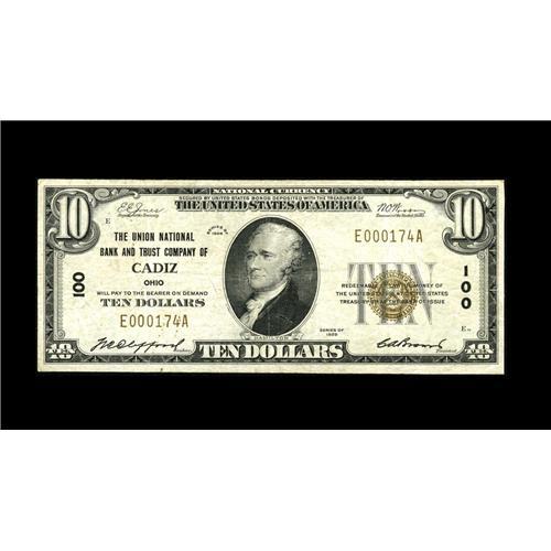 <B>Cadiz, OH</B></I> - $10 1929 Ty. 1 <B>The Union NB & TC</B></I> Ch. # 100<BR>This Harrison County bank issued the 1929 series under no less than three separate titles. This is the second. <B>Very Fine.</B></I><BR><BR><b>Shipping:</b> Coin/Currency (<a target="_blank" href="http://www.heritageauctions.com/common/shipping.php">view shipping information</a>)