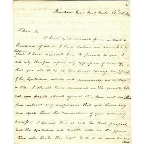 <B>Cadwallader D. Colden Autograph Letter Signed</B></I> in full. Four pages, 8" x 9.75", Harlem Near New York, October 28, 1822. It reads in part, "<I>The question is then, did the state of New York do an injurious act towards, Rhode Island or towards any of her sister states when she made exclusive grant to Fulton under which we claim? It seems to me that this question will be best answered by supposing that when Fulton applied to the state of New York, he had addressed himself to the state of Rhode Iland. (sic) Had by anticipation, represented all the advantages of steam navigation as they are now enjoyed; had represented that he could not make the experiments and expend the money necessary to make effectual experiments without he could be assured of an exclusive right to the use of his inventions for a limited time, without such exclusive right he would reap no advantage tho he should be ever so successful in the execution of his plans.</B></I>" <BR><BR>The letter is no doubt making reference to Robert Fulton and his steamboat plans. Fulton had died in 1815, and his intellectual property is what is being discussed in this letter between Colden and Caddington Billings. After the steamboat was introduced, there were years of rivalry and disputes as to the originality of the idea and the actual father of the design. Regardless of Fulton's place in the pantheon of inventors who lay claim to the steamboat's inception, Fulton deserves credit for giving the steamboat the precedence as a passenger carrying conveyance as well as for transportation of freight. All attempts at this before Fulton proved fruitless and inefficient. Colden, the son of the colonial leader of the same name, himself was a statesman and politician who devoted much of his later life to the completion and technology of the Morris Canal in New Jersey. His connection to waterways and freight conveyances are what ties him so closely to Fulton and his inventions. Colden even wrote a biography of Robert Fulton's life and inventions. The content of this letter is fascinating, and it would be extremely desirable for any inventor or transportation enthusiast! The paper is slightly age toned, but the ink is crisp and dark, fine overall. The letter comes with a complete typed transcription of the text.<BR><BR><b>Shipping:</b> Flat Material, Small (<a target="_blank" href="http://www.heritageauctions.com/common/shipping.php">view shipping information</a>)