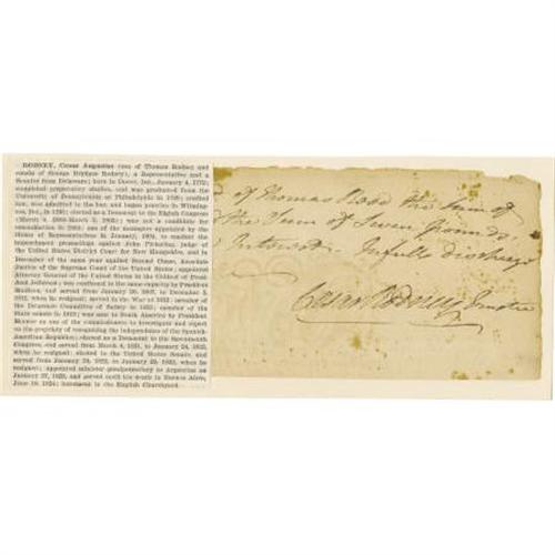 <B>Caesar A. Rodney Autograph Note Signed,</B></I> one page, 9" x 3.75", n.p., 1779, to Thomas Reed. In part: "<I>...thus recd. Of Thomas Reed the sum of principal money and the Sum of Seven Pounds, and five pence Interest...</B></I>"<I> </B></I>Trimmed and mounted, with a printed biography affixed to left margin affecting a few words, else very good. <I>Ex. Henry E. Luhrs Collection.</B></I><BR><BR><b>Shipping:</b> Flat Material, Small (<a target="_blank" href="http://www.heritageauctions.com/common/shipping.php">view shipping information</a>)