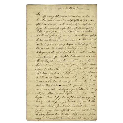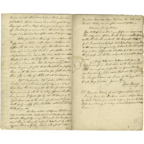 <B> Caesar Rodney (1728 - 1784), Signer of the Declaration of Independence, Autograph Letter Signed, </B></I> "<I>Caesar Rodney</B></I>", three pages with integral address leaf, 8.25" x 13.25", [Philadelphia], November 27 and November 29, 1775 to his brother Thomas Rodney detailing early intelligence on the fall of Montreal to Montgomery and arrival of British reinforcements in Boston. <BR><BR> Rodney, attending the Continental Congress then in Philadelphia, reports on his safe arrival"<I>After a very cold disagreeable ride, I am in town; and have had since I came a smart fit of the asthma...</B></I>" After requesting more firewood and warning his brother about a major water hazard along the Delaware River, he notes that "<I>Missrs. [Bushrod] Washington, Missrs. [Horatio] Gates, Collo. Custis & his Lady and one Mr. Lewis all of Virginia set out from here this morning for the Camp at Cambridge accompanied by all the military officers, the three Companies of light-infantry and the Company of light-horse - As they come up General McKinly with forty or fifty of his Battalion attended them to Schuylkill-ferry- We have certain intelligence that there are 2500 or at least 2000 troops landed at Boston from Ireland and it is thought by many, that with this reinforcement they will make a push to get out, by attacking our lines - If they should attempt it, I hope our brave American Boys who have been hitherto fortunate will give us a good amount of them - </B></I>" Rodney continues the letter two days later to report: "<I>You will find in this day[']s paper an account of the surrender of Montreal to General Montgomery on the thirteenth instant; The Congress has as yet received no Express, but expect one every hour as the account is generally believed; Mr Livingston being a man of Carrector [sic], Brother to a member of the Congress and brother-in-law to General Montgomery...</B></I>" He adds a postscript: "<I>Remember to bring up one of Caesar's frocks that I may have his Uniform made, and as you come by Land I desire you would inform yourself what State our Money printing is in, I shall want to know-</B></I>"<BR><BR> Richard Montgomery captured Montreal on November 12, 1775. An express rider from General Philip Schuyler reached Philadelphia on November 29 with official news from Montgomery the same day. Montgomery's express reached George Washington in Cambridge on November 28. Montgomery would soon march east to join Benedict Arnold in an attempt to capture Quebec. It was during that campaign that Rodney was killed in action, December 31, 1775. Rodney is probably best remembered for his all-night ride from Delaware to Philadelphia in order to break the deadlock in the Delaware delegation over independence. He arrived just in time to break the tie and cast Delaware's vote in favor of independence on July 2, 1776. Reinforced along left margin, a few very minor marginal tears, small loss (repaired) from wax seal tear, else very good condition. War-date Caesar Rodney letters with content are quite scarce -- this is a fine example. From the Henry E. Luhrs Collection. Accompanied by LOA from PSA/DNA.