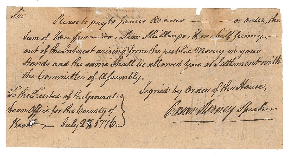 Revolutionary War-dated ADS, signed “Caesar Rodney, Speaker,” one page, 7 x 3.5, July 28, 1776. Promissory note issued to "the Trustee of the General Loan Office for the County of Kent," in full: "Please to pay to James Adams—or order, the Sum of Ten Pounds, Six Shillings, & one half penny—out of the Interest arising from the public money in your Hands and the same shall be allowed you at Settlement with the Committee of Assembly." Signed boldly at the conclusion by Rodney. In very good to fine condition, with edge tears and paper loss to the top, partially repaired with tape on the reverse.