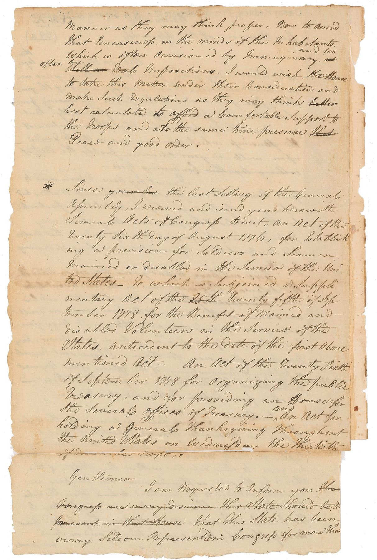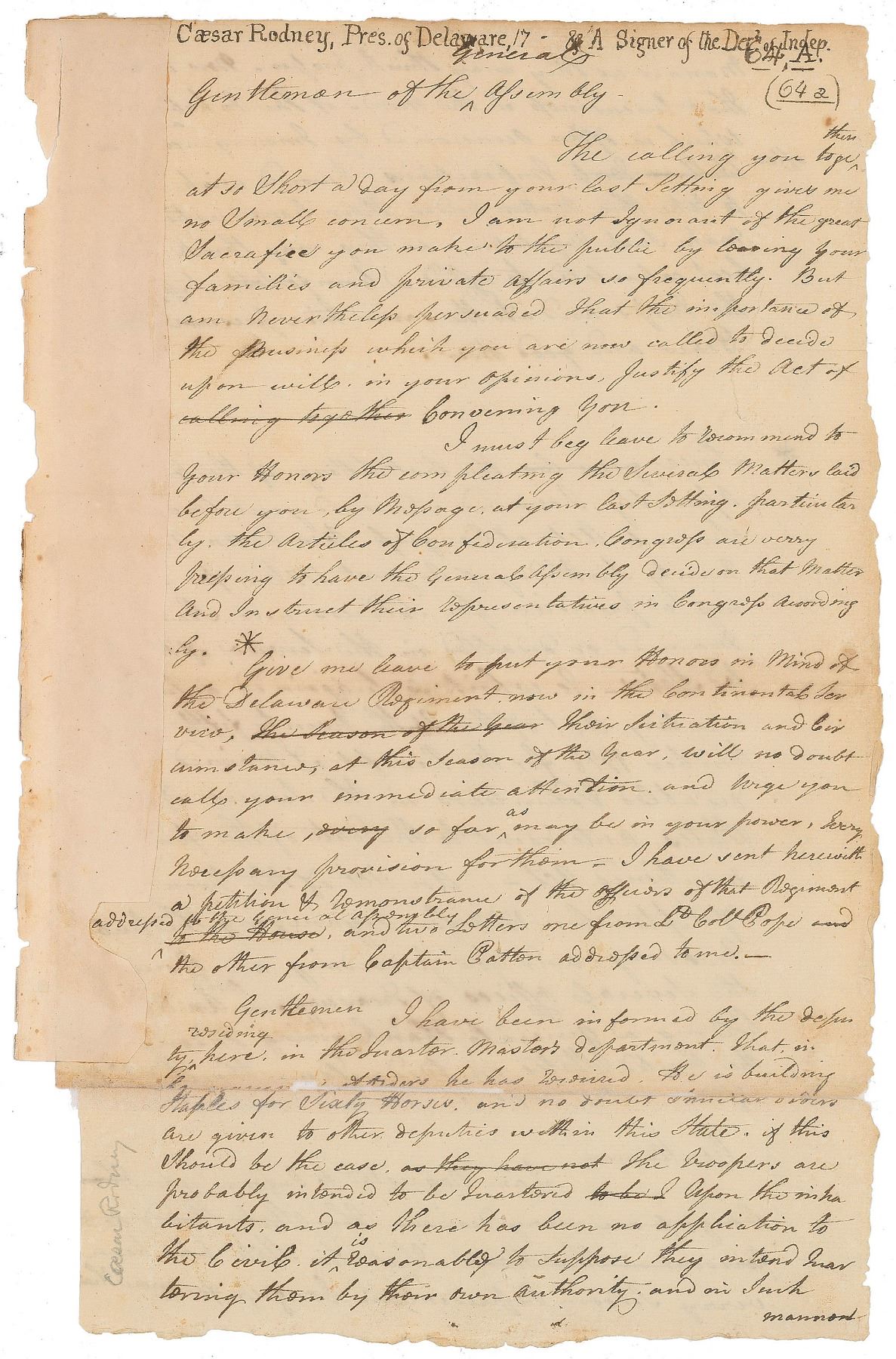Signer of the Declaration of Independence from Delaware (1728–1784) who, on July 2, 1776, famously rode his horse 80 miles non-stop to break the deadlock within the Delaware delegation and vote in favor of independence. Historic Revolutionary War–era handwritten letter, unsigned, one page both sides, 7.75 x 12.5, circa 1778–1779. As president of Delaware, Rodney encourages the delegates of the Delaware General Assembly to support the ratification of the Articles of Confederation. In part: "The calling you together at so short a day from your last sitting gives me no small concern. I am not ignorant of the great Sacrifice you make to the public by leaving your families and private affairs so frequently. But am nevertheless persuaded that the importance of the business, which you are now called to decide upon, will in your opinions, justify the act of convening you. I must beg leave to recommend to your Honor the completing the several matters laid before you, by message, at your last sitting, particularly the Articles of Confederation. Congress are verry pressing to have the General Assembly decide on that matter and instruct their representatives in Congress accordingly…Since the last sitting of the General Assembly, I received and send you herewith Several Acts of Congress, to wit, an Act of the twenty sixth day of August 1776, for establishing a provision for Soldiers and Seamen maimed or disabled in the Service of the United States—to which is subjoined a Supplementary Act of the Twenty fifth of September 1778 for the Benefit of Maimed and disabled Volunteers in the Service of the States, antecedent to the date of the first above mentioned Act—An Act of the Twenty Sixth of September 1778 for organizing the public Treasury, and for providing an House for the several offices of Treasury—and an Act for holding a General Thanksgiving throughout the United States on Wednesday the Thirtieth of December next." In very good to fine condition, with old tape along the left side, an unobtrusive tear to the body, and the trimmed and detached lower section held in place with archival tape.