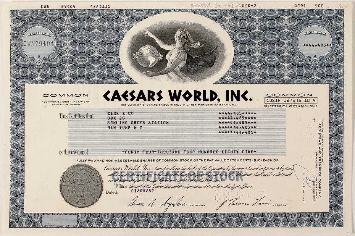 Vignette of a beautiful woman levitating the world highlights this Nevada gambling stock. Good for 44,485 shares. 8 x 12 inches. City: Las Vegas State: Nevada Date: 1982 ID# 44206