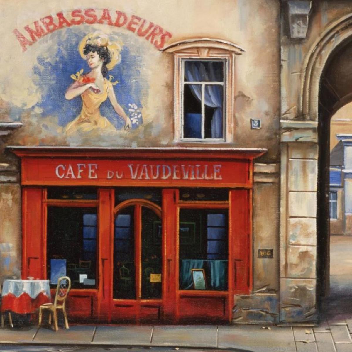 "Cafe Du Vaudeville" is a limited edition Giclee on Canvas by Alexander Borewko. The piece is numbered, hand siged by the artist, and come with a letter of authenticity. Measures approximately 16" x 30".