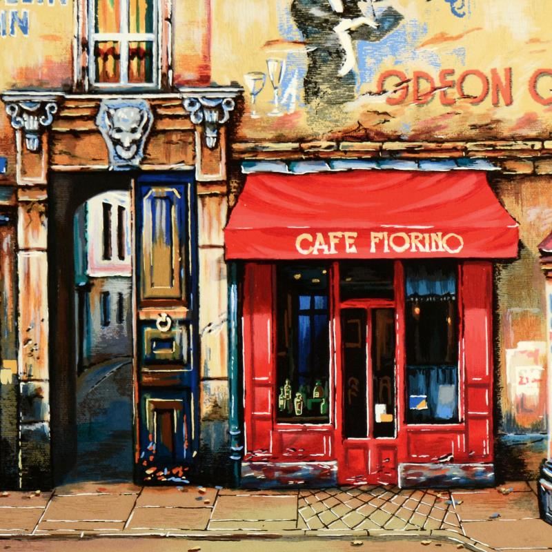 "Cafe Furino" is a limited edition giclee on paper by Alexander Borewko, numbered and hand signed by the artist! Measures approx. 19.5" x 17" (with border); 15.5" x 14.5" (image).