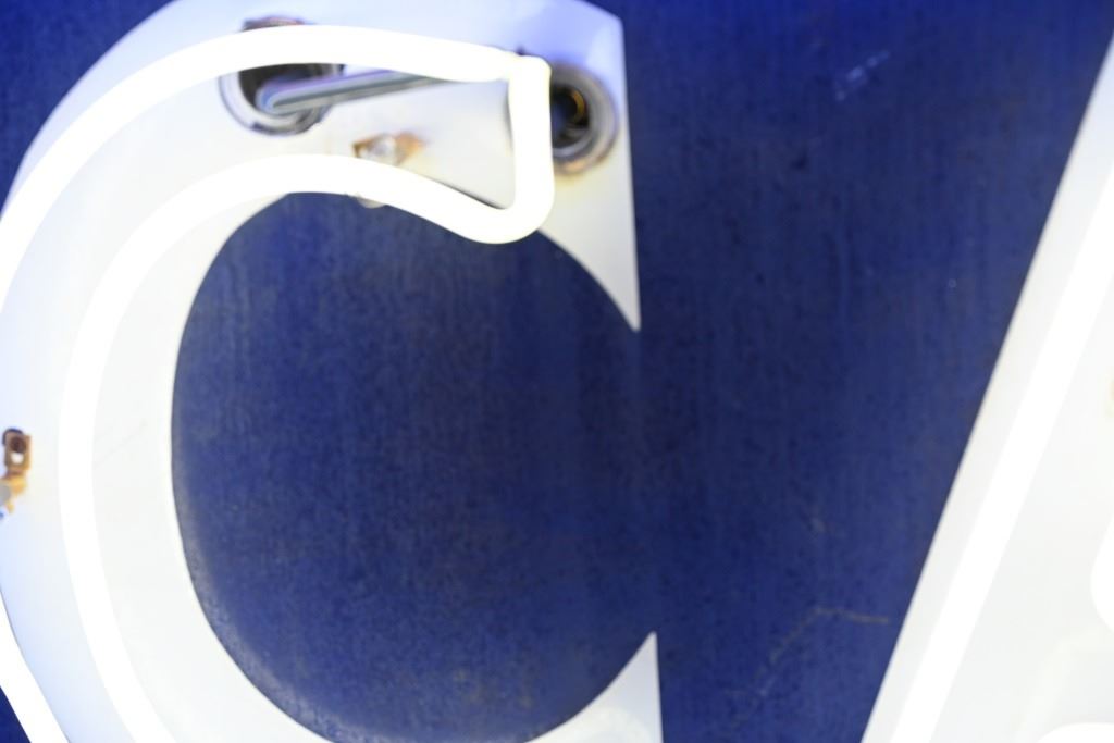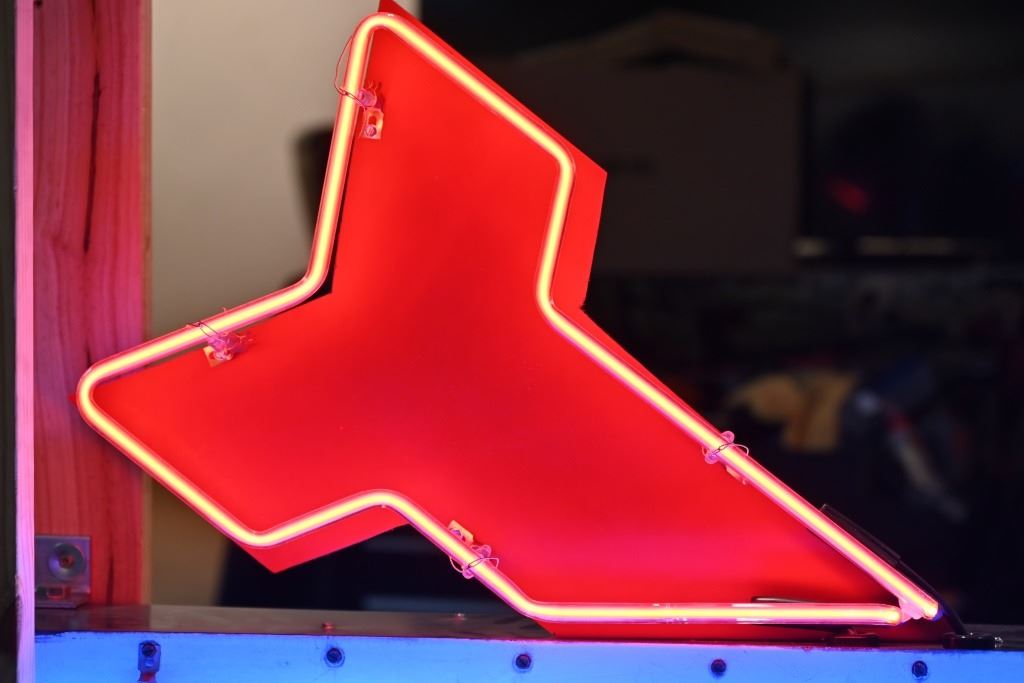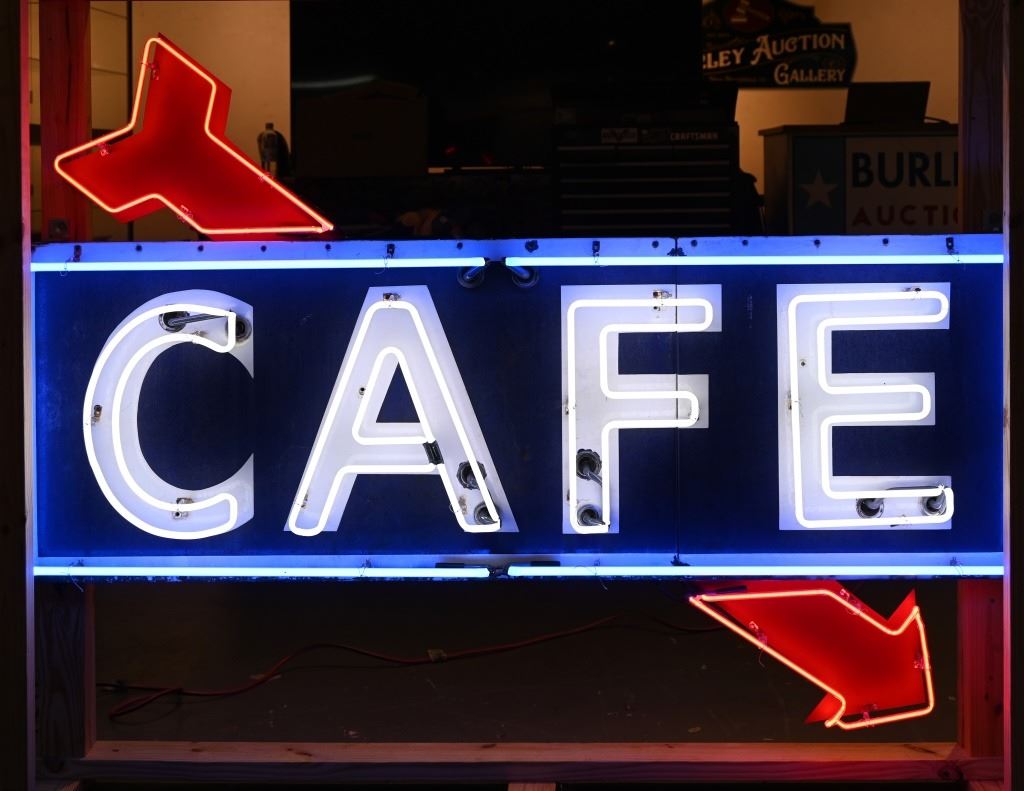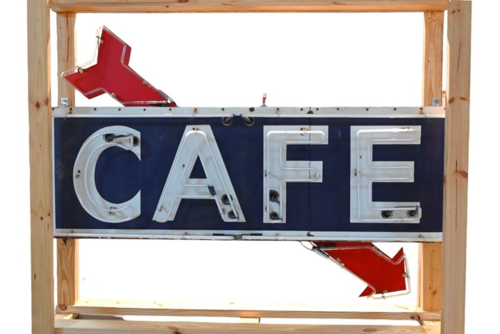 Original porcelain cafe neon with added neon arrow. Circa 1950s. 72-1/2" x 39-1/4" x 8-3/4". Item pick up recommended.