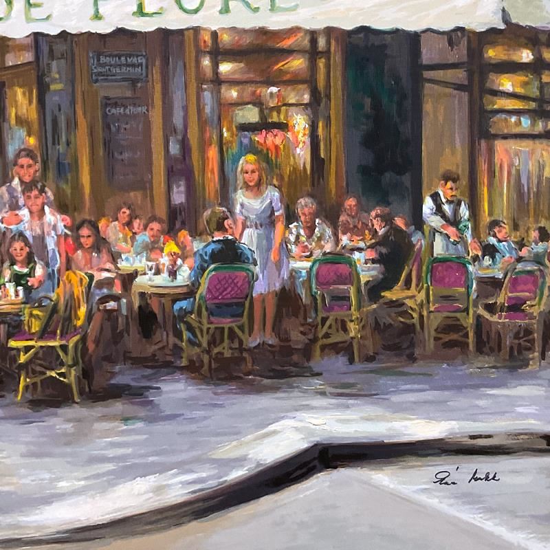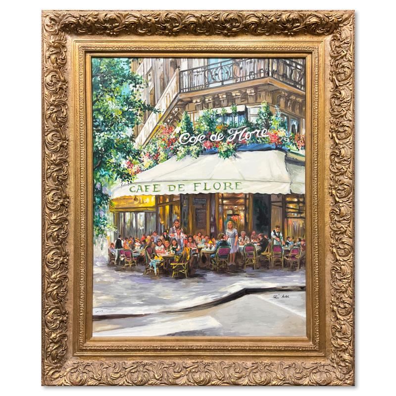 "Cafe de Flore" is a hand embellished limited edition serigraph on canvas by Eva Makk, numbered 268/275 and hand signed by the artist. This piece comes framed. Includes Letter of Authenticity. Measures approx. 53" x 43.5" (frame), 39.5" x 29.5" (image). There is some wear on the frame.