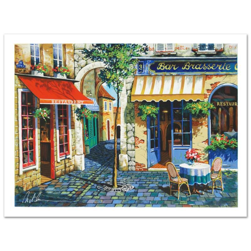 Cafe in Provence" is a limited edition lithograph on paper by Anatoly Metlan, numbered and hand signed by the artist! Includes Certificate of Authenticity! Measures approx. 25" x 19" (with border), 22.5" x 17" (image).