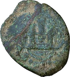 Oriente Latino. Caffa. Follaro, emissione genovese. D/ [CAFFA VV]. Castello. R/ Tamgha dell'Orda d'Oro. Retovski 260. AE. g. 0.81 RRR. MB+.