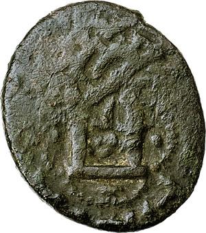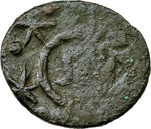 Oriente Latino. Caffa. Follaro, emissione genovese. D/ [CAFFA ??]. Castello. R/ Tamgha Giray. Retovski 261. AE. g. 1.45 RRR. qBB.