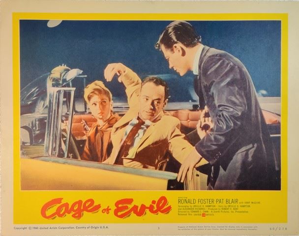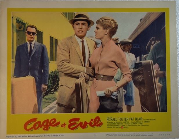 Cage of Evil (United Artists, 1960) lobby card. Drama, Crime. Starring Ron Foster, Patricia Blair, Harp McGuire, John Maxwell, Preston Hanson, Douglas Henderson, Hugh Sanders, Helen Kleeb, Robert Shayne, Owen Bush, Eve Brent. Directed by Edward L. Cahn. Very minor edge wear, very minor creases. Excellent. (11"x14").